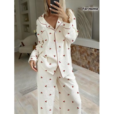Red Women's Cherry Print Long Sleeve Pajama Set - Cozy & Cherry Design, Button-Up Front, Ruffled Collar, All-Season Comfort, Casual Style, Perfect for Home