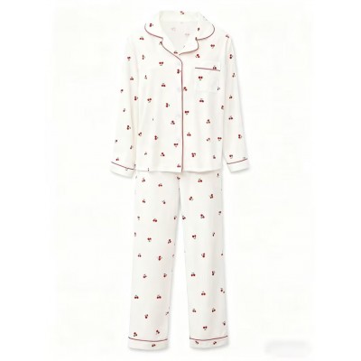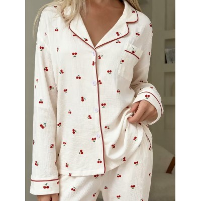покрытие > Clothing and accessories > Red Women's Cherry Print Long Sleeve Pajama Set - Cozy & Cherry Design, Button-Up Front, Ruffled Collar, All-Season Comfort, Casual Style, Perfect for Home